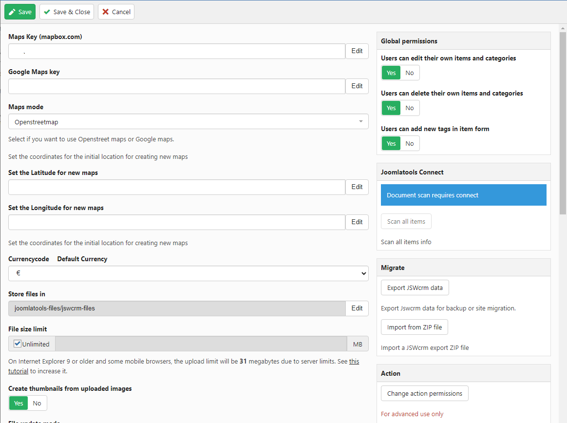 The settings screen of JSW CRM