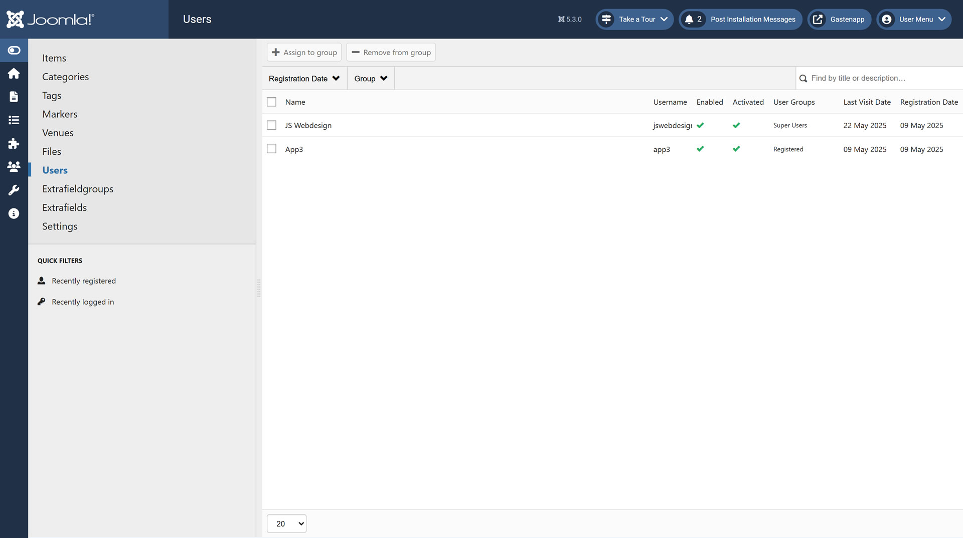 Quick icons module voor de administrator